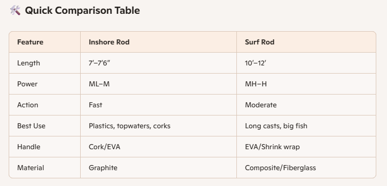 Longer rods, such as 8’ to 10’ surf rods, give you extra distance when you need to launch baits over breaking waves or deep channels. I reach for a 7’ to 7’6” rod for wading bays and flats because this range casts lures far enough while staying manageable throughout a long fishing day.